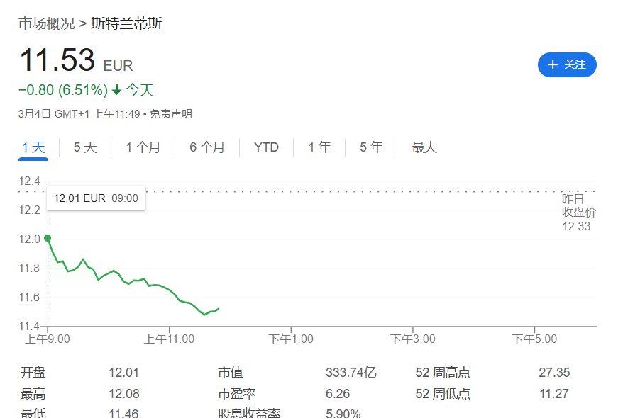 受关税打击的公司包含道奇汽车的制作商Stellantis,股价下跌超6%,以及梅赛德斯-奔跑,股价下跌约5%。