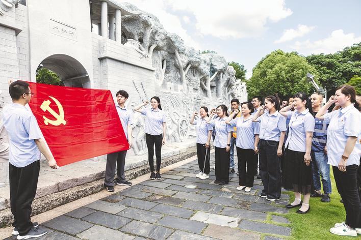 在武昌起义门,中建三局总承包公司湖北分公司多项目党支部开展纪念革命先烈、学会勇敢主题教育活动